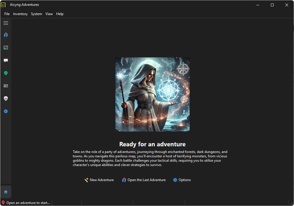 Aicyng Adventures allows you to explore dungeons, villages and castles. Battle Monsters and interact with non-Player Characters. Using the Open AI API generating an adventure creates a unique story line with characters, quests and locations.